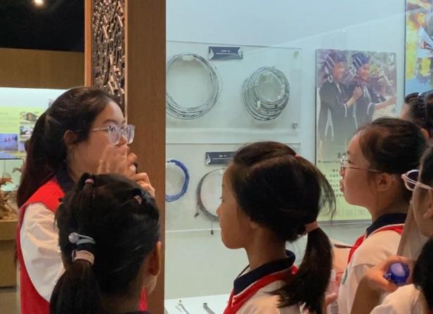 “工艺奇葩”展厅的毛南族斗笠让孩子们眼前一亮,一位同学看着斗笠,顺口念出柳宗元的诗句:“孤舟蓑笠翁,独钓寒江雪”。“斑斓霓裳”展厅中瑶族、侗族、高山族、仡佬族等民族的传统服饰整齐陈列。女生们围着一对精美的耳环驻足,讲解员介绍道:“这个是黎族耳环,有时因耳环沉重致使耳朵被拉长,劳动时甚至需将耳环翻到头顶呢。”