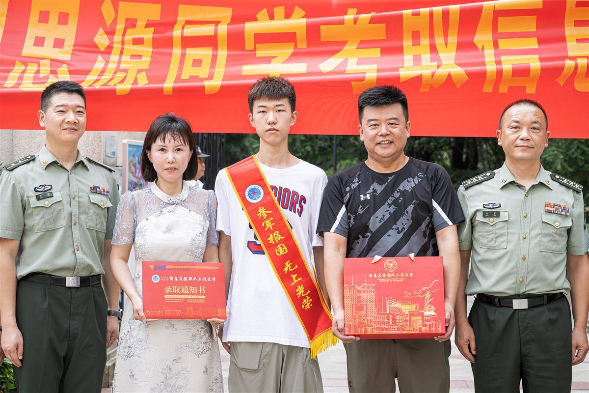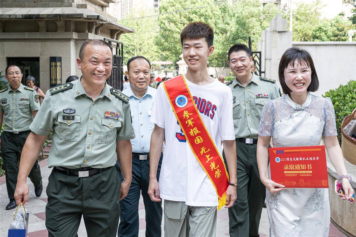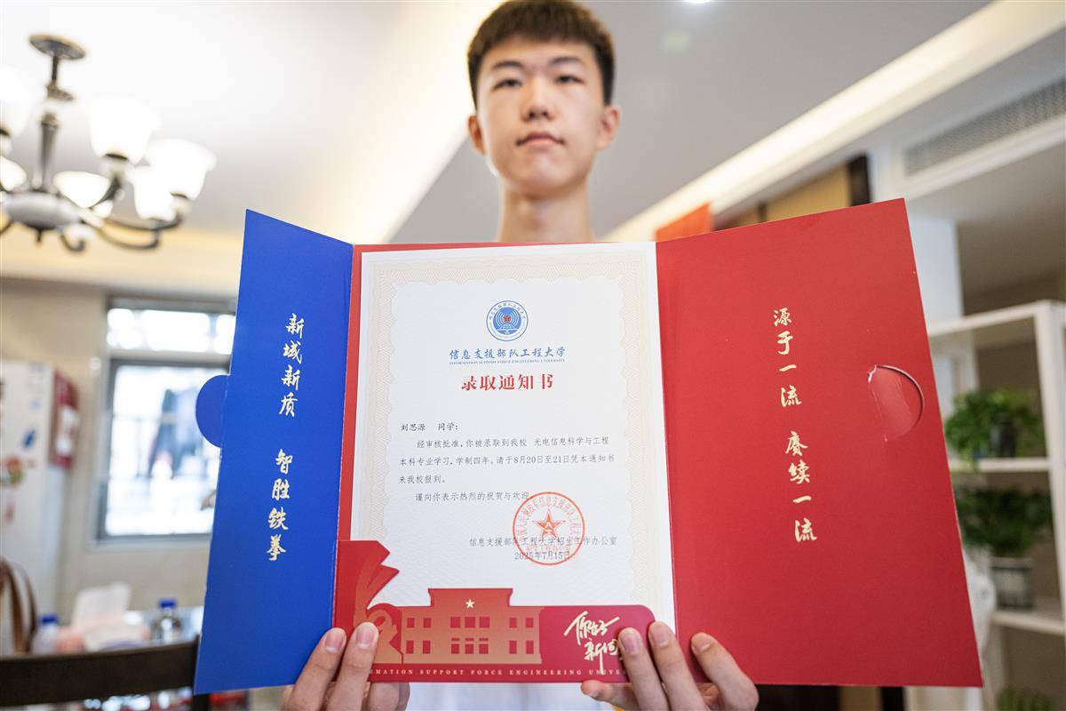湖北日报讯(记者沈早慧、任勇)7月18日上午,在武汉市汉阳区中铁世纪金桥锦湖园小区,武汉三中学生刘思源收到了信息支援部队工程大学成立以来的首封录取通知书。