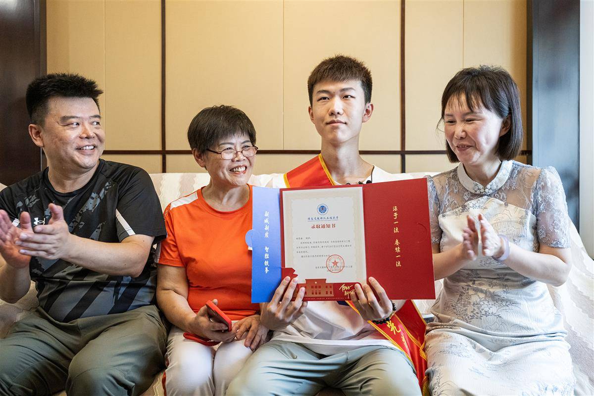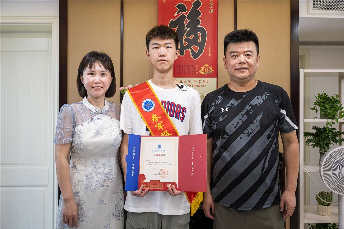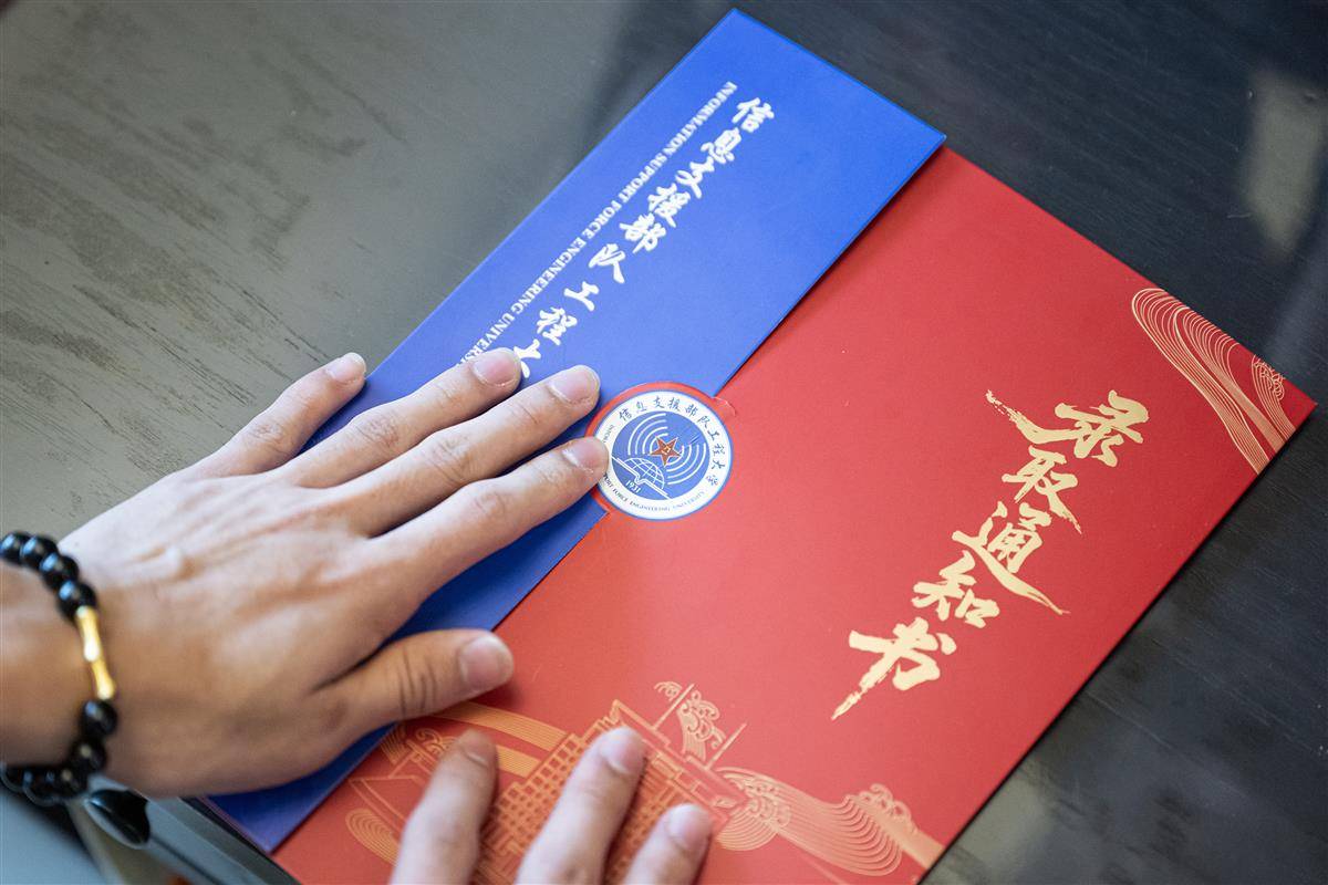 在家人和校方的见证下,他亲手拆开了录取通知书。蓝红配色的录取通知书两侧上分别印有“新域新质,智胜铁拳”“源于一流,赓续一流”字样。