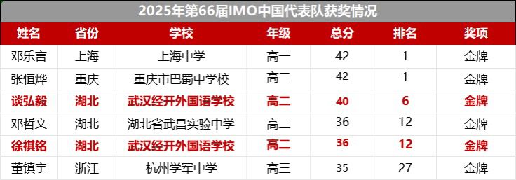 2025年7月19日,第66届国际数学奥林匹克竞赛(IMO)在澳大利亚黄金海岸圆满落幕。中国队以231分的绝对优势夺得团体总分排名第一,共摘得6金。其中,湖北省武昌实验中学邓哲文与武汉经开外校的徐祺铭、谈弘毅组成的“湖北三剑客”包揽3枚金牌,创下IMO史上同一省份单届夺金数最高纪录!