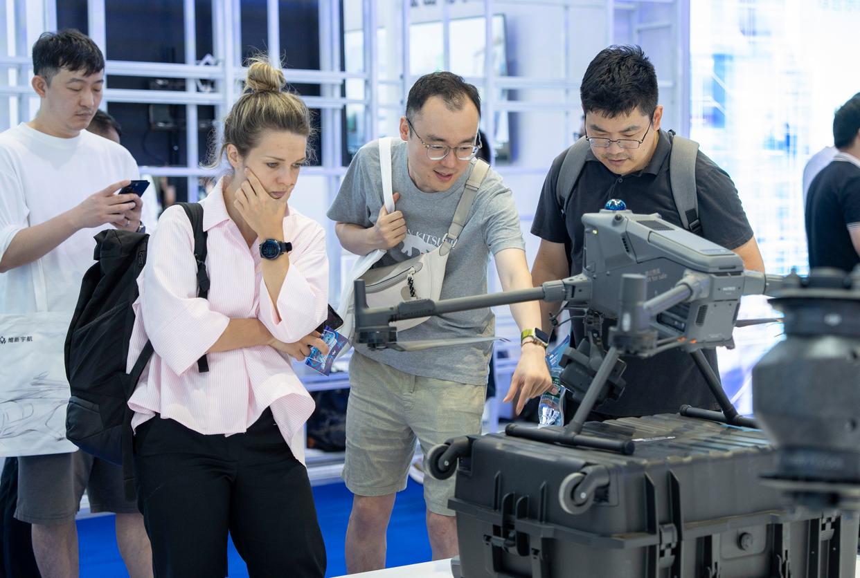 7月23日,观众在博览会上了解一款无人机。新华社发(张悦 摄)