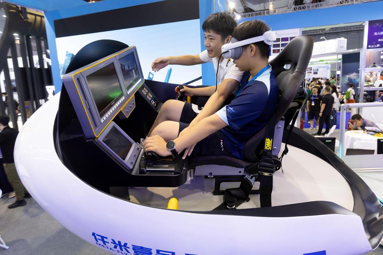 7月23日,一名参观者在工作人员的指导下体验模拟飞行。新华社记者 王翔 摄