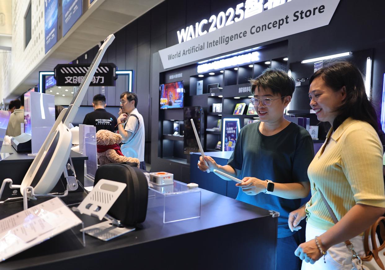 7月26日,参观者在一个依托大模型数据打造的星辰纺织智能体展品旁交流讨论。新华社记者 方喆 摄
