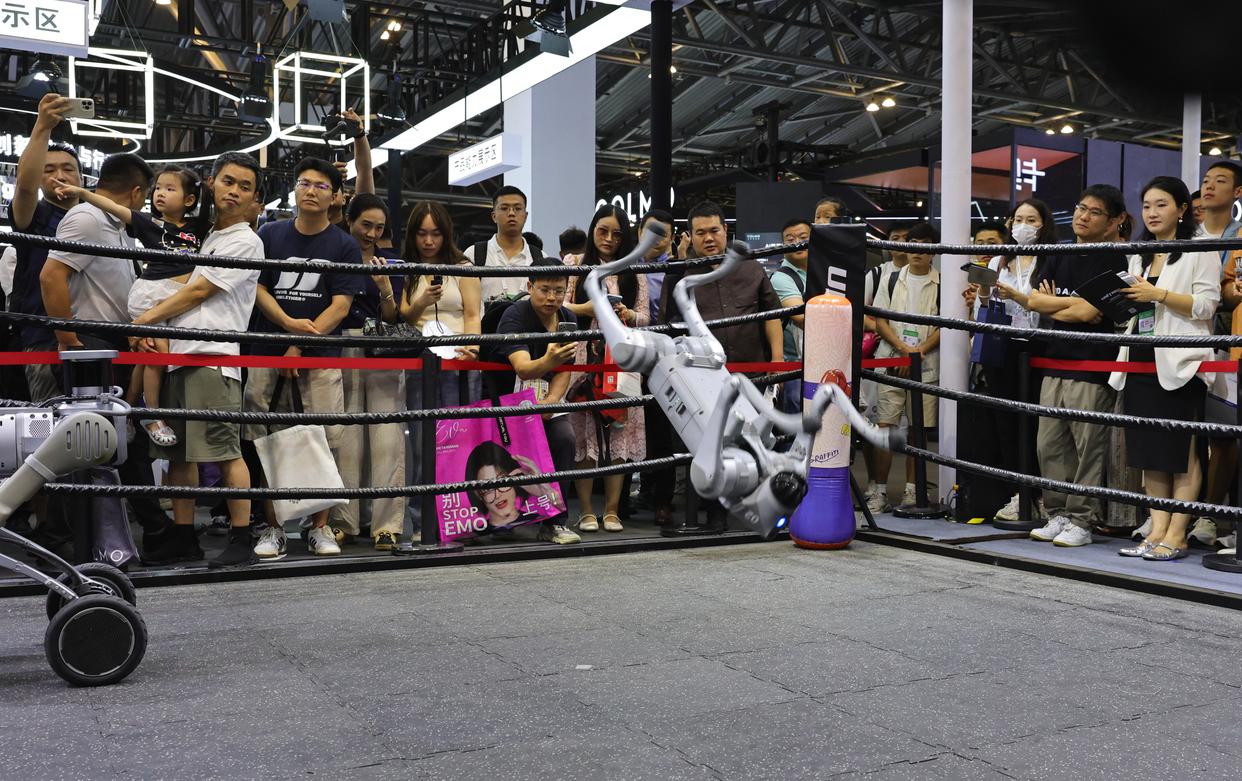7月26日,参观者观看四足机器人进行后空翻表演。新华社记者 方喆 摄