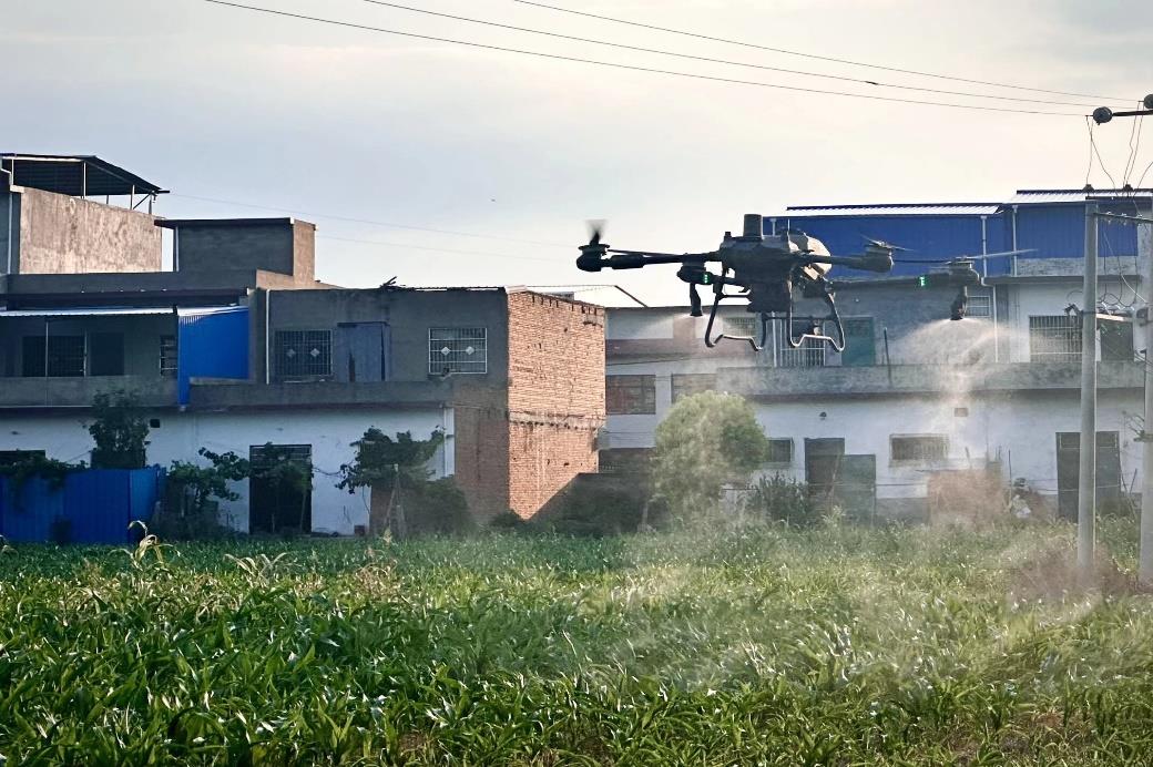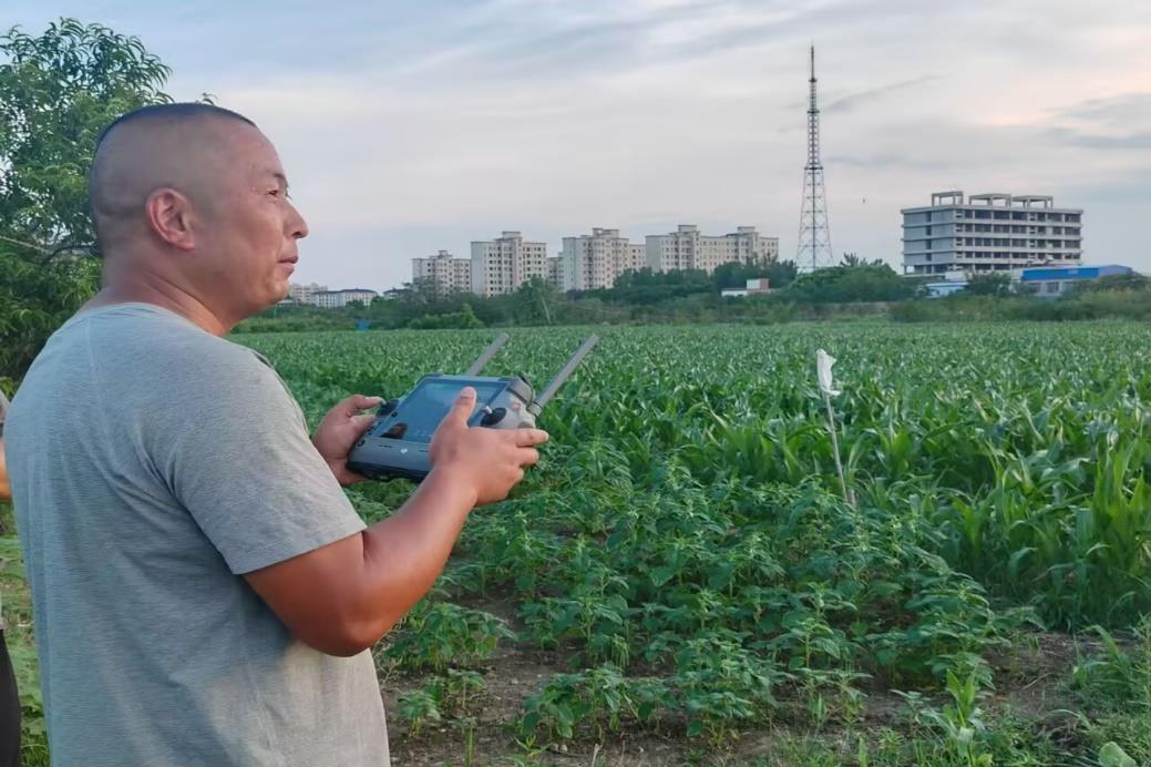 7月11日傍晚,夕阳正斜倚着青翠的麦梢,实践团成员们在邓州市东盛村的一片田埂上采访了飞手吴振压师傅。他正在进行当天的无人机打药作业。指尖在遥控器上轻旋,银灰色的无人机便如归巢的雨燕,驮着药箱在麦田上划出一道道流动的弧线。百亩玉米地的打药任务,在无人机的精准操控下很快完成。