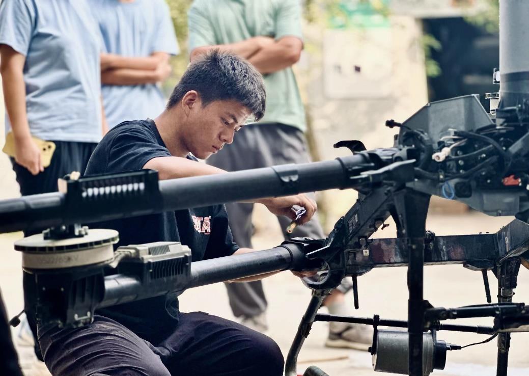 7月9日,实践团成员们来到了邓州市大疆农业无人机修理点,观摩一场精彩的无人机维修演示。维修师傅们精准辨别故障接点,修理折断机翼,调试感应系统,细致检查零部件,行云流水般的拆机与组装步骤无不展现出极高的专业素养与丰富的经验。经过四个多小时的高强度作业,随着最后一道检测程序完成,这架农业无人机恢复正常,平稳升空。