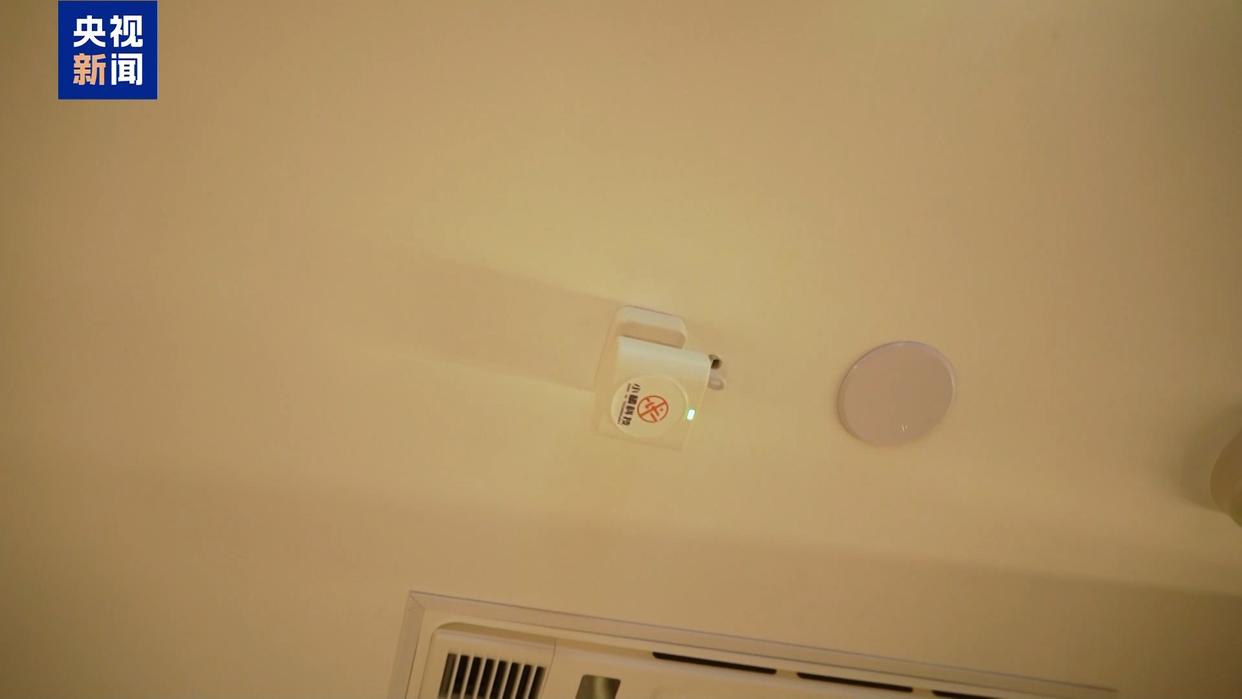 在天花板上,这家养老机构和武汉大学北斗科技中心共同推出了一个产品。在容易出现滑倒的区域,如果摔倒,平躺或者半躺的状态,它会通过毫米波雷达检测,如果倒地后1分钟是静止的,它就会直接发出报警信号。同时通过算法,家里其他的物体在这个区域中是不会触发报警的,对于老年人在这些容易滑倒的范围内进行监测,它的作用会很大。