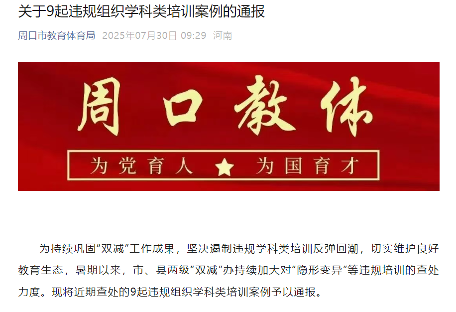 7月30日,“周口市教育体育局”微信公众号,通报9起违规组织学科类培训案例,具体如下↓↓↓