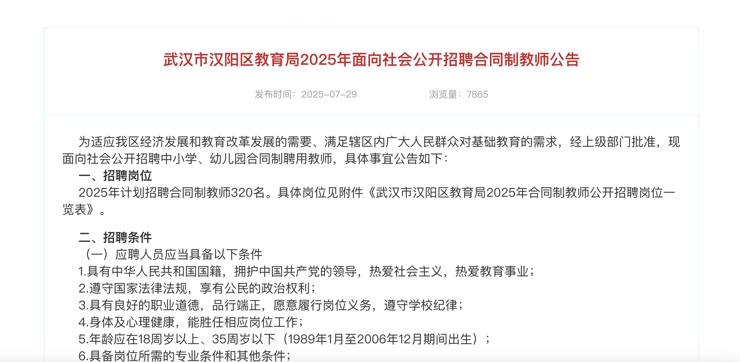 湖北日报讯(记者朱惠、通讯员黄璜、尚迪爽)7月29日,武汉市汉阳区教育局发布《2025年面向社会公开招聘合同制教师公告》,面向社会公开招聘320名中小学、幼儿园合同制聘用教师,7月30日开始报名。