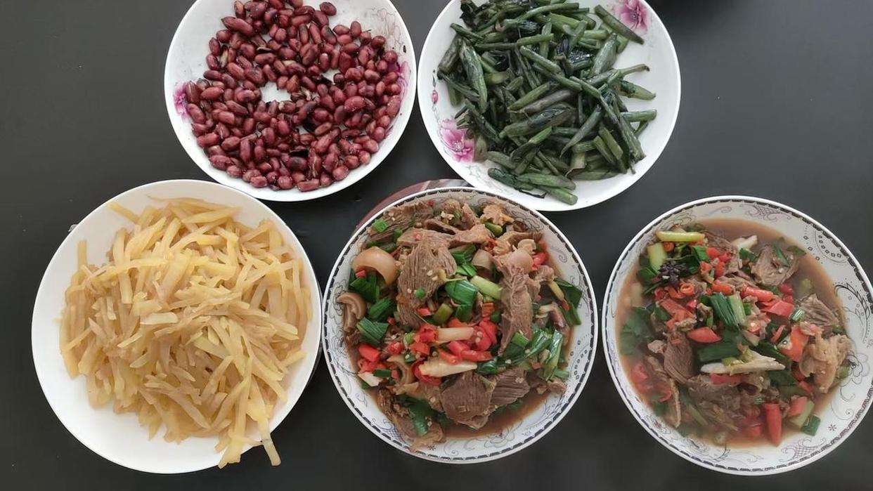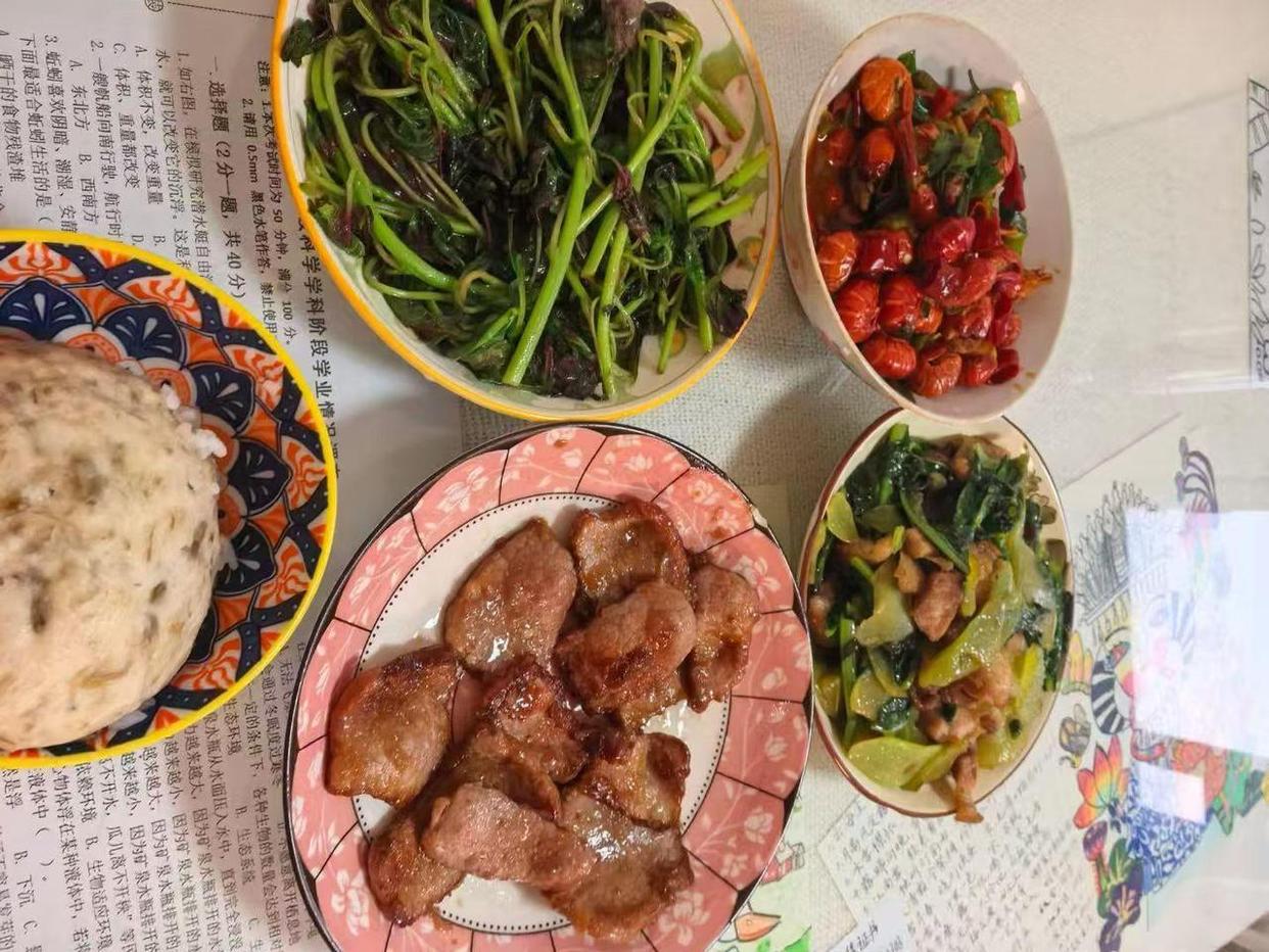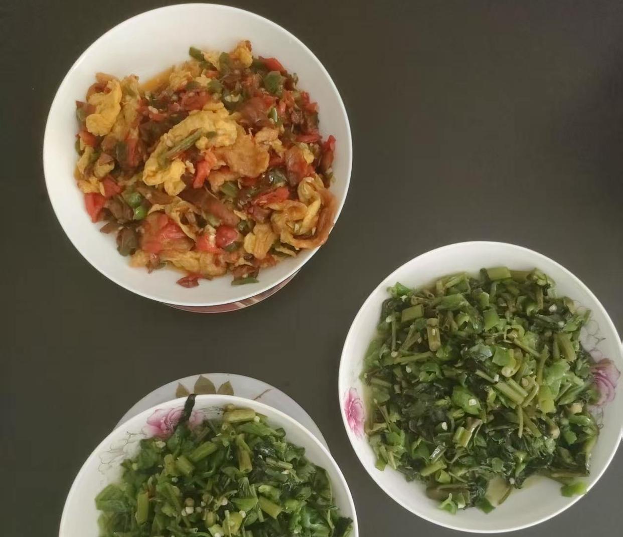 子浩和爸妈完成的一桌菜,两道素菜都是子浩烧的。 受访者供图