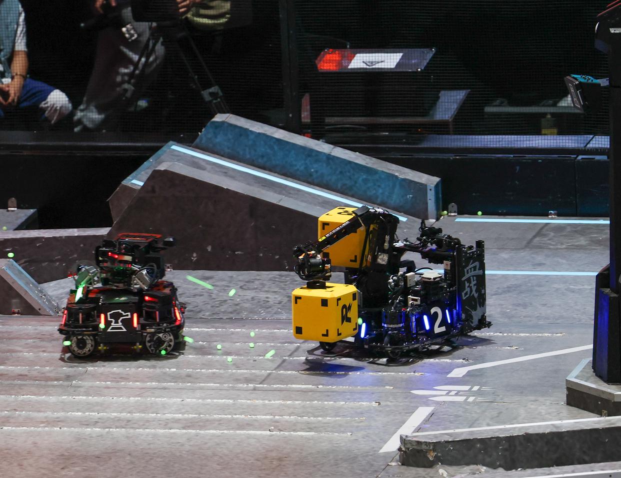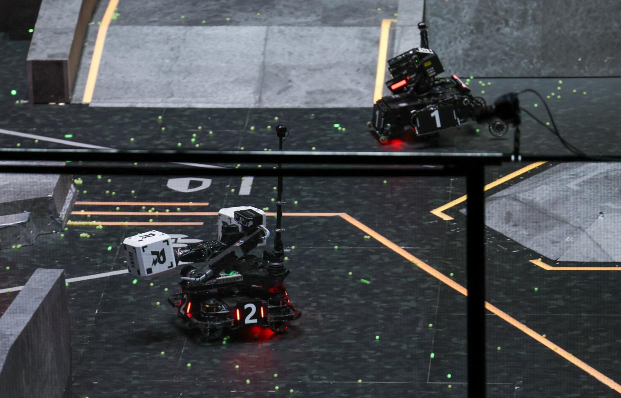 8月3日,上海交通大学交龙战队的机器人(左)和中国科学技术大学RoboWalker战队的机器人在决赛中。新华社记者 毛思倩 摄