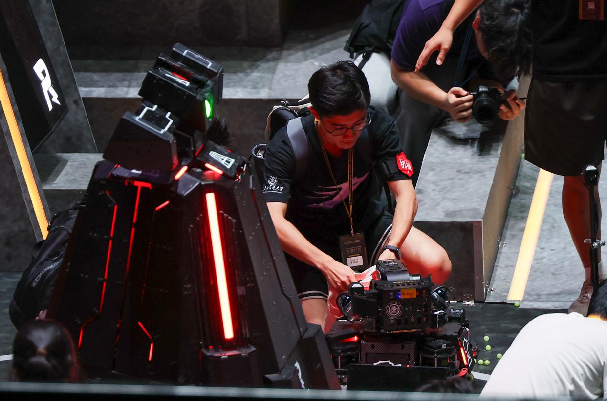 8月3日,上海交通大学交龙战队的成员在决赛间隙调试机器人。新华社记者 毛思倩 摄