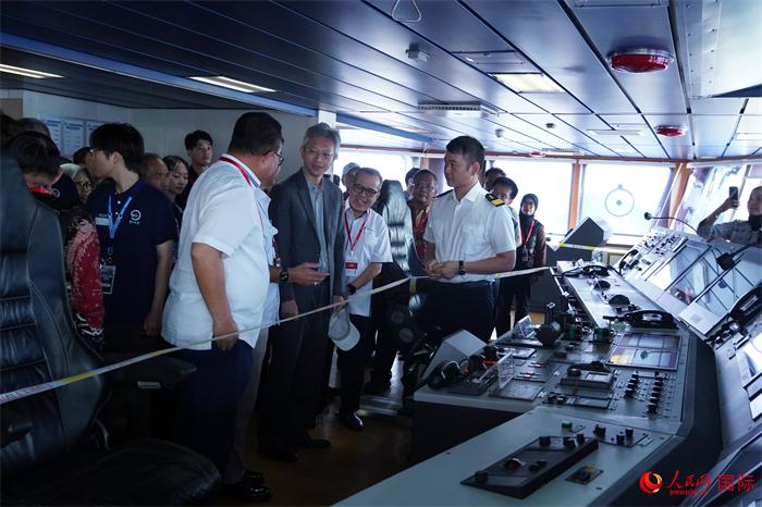 中国驻印尼大使王鲁彤等嘉宾参观“嘉庚”号科考船驾驶室。人民网记者 曹师韵摄