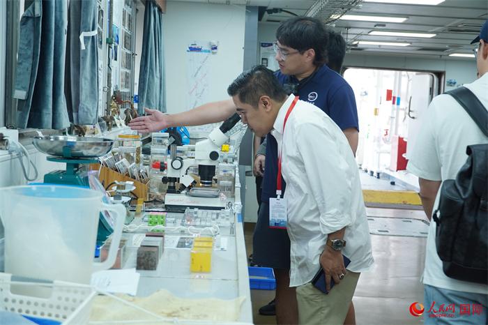 开放日当天,观众在“嘉庚”号科考船主实验室参观由师生从海底采集的科研样本。人民网记者 曹师韵摄