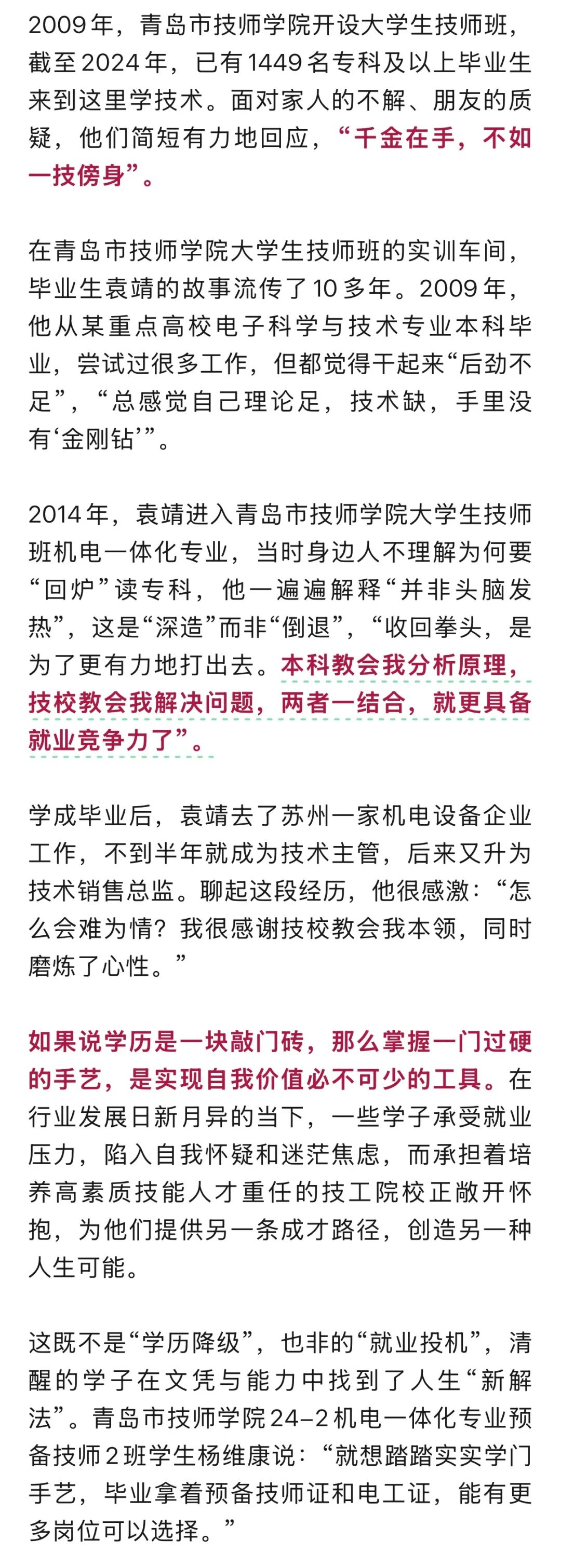 这一现象并非个例,广东、山东、湖北等地的多所专科院校也开设了面向本科生的技师班。有人称,这种模式是培养“学历+技能”两条腿走路的“π”型人才;有学生笑言“‘π’型人才撒开腿就能跑,跑得还更快”。从追求一纸文凭,到钻研一门技术,看似与众不同的选择,能否成为转换赛道的新路径?新华每日电讯记者走进已经实践多年的青岛市技师学院一探究竟。