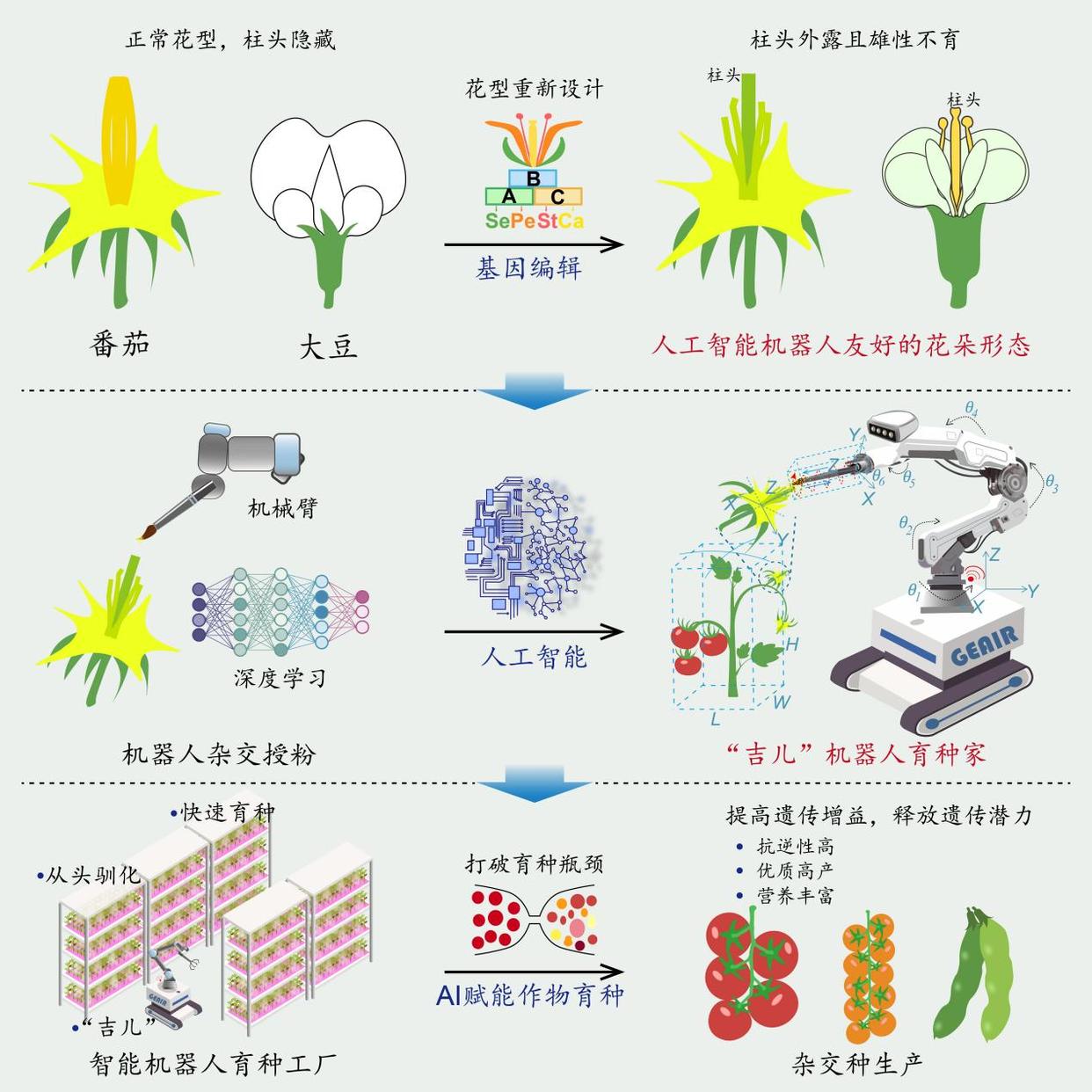 中国科学院遗传与发育生物学研究所许操研究员带领的智能育种攻关团队将BT(生物技术)+AI(人工智能)深度融合,首次提出作物—机器人协同设计理念。团队通过基因编辑重新设计作物花型,快速精准创制“机器人友好”的结构型雄性不育系,运用深度学习和人工智能成功研制世界首台可自动巡航杂交授粉的智能育种机器人“吉儿”(GEAIR),打破杂交育种和制种瓶颈,大幅降低育种成本、缩短育种周期、提高育种效率。该成果11日发表在《细胞》上。