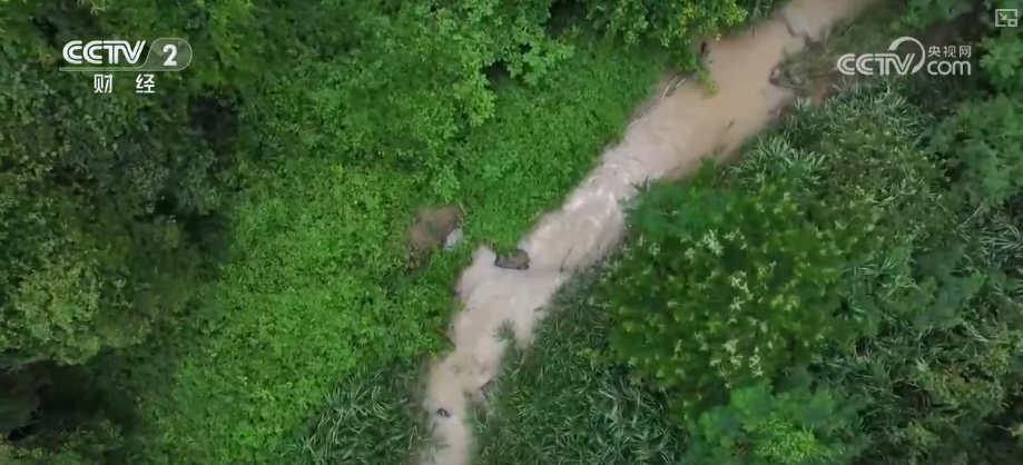 在景洪市勐养镇213国道旁,从航拍画面上可以看到,山上有一条垂直的小道,这就是大象踏出来的。大象从这条小道下来后,跨过国道会继续前往这里,这条小道看似像人走出来的,其实也是大象踏出来的。