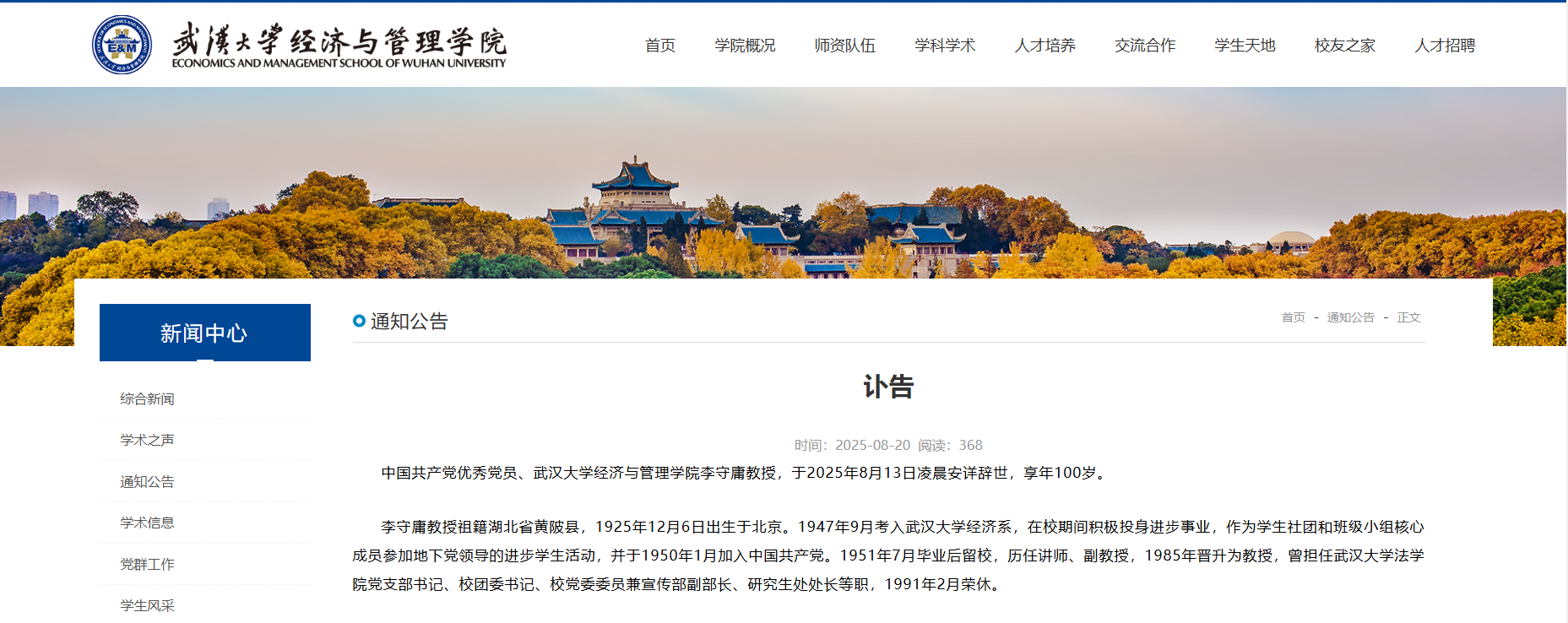 中国共产党优秀党员、武汉大学经济与管理学院李守庸教授,于2025年8月13日凌晨安详辞世,享年100岁。