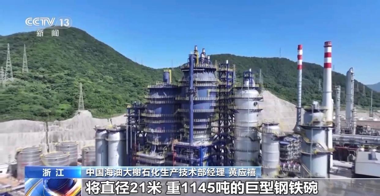 中国海油大榭石化生产技术部经理黄应禧:在项目建设过程中,因核心设备反应器、再生器的封头直径为国内最长,项目团队首创“仰脸衬里施工技术”,将直径21米、重1145吨的巨型钢铁碗先翻身吊装至25米高空,再由施工人员钻进两器内部进行“仰脸”衬里施工。