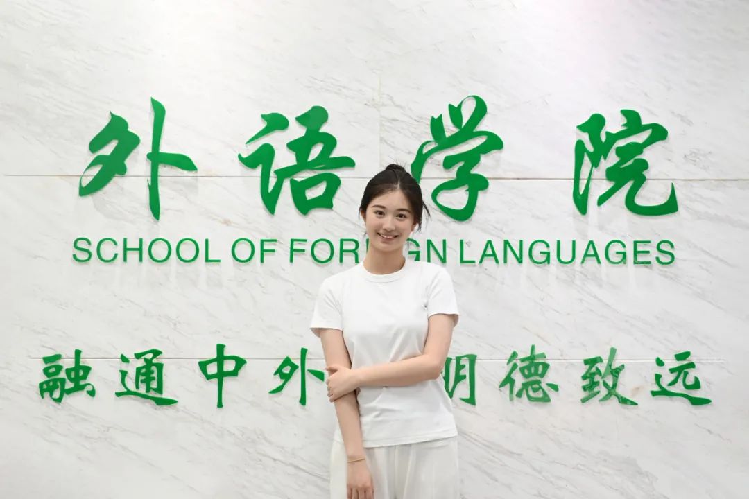 然而专业学习并非坦途,大二时的口译课曾让张誉之倍感压力,她当时觉得自己的翻译基础很薄弱,要从头开始恶补。面对挑战,张誉之没有退缩,而是将实践视为提升专业能力的关键。她坚信,只有通过不断的实践,才能真正巩固知识并提升能力。因此,她总是认真完成老师布置的每一项作业,将每一次练习都视为提升自我的宝贵机会。同时,她还坚持每天进行听说练习和词汇积累,确保自己语言成绩的稳步提高。在口译实践课程中,交替传译和同声传译不仅要求扎实的专业知识,还需要良好的心理素质。张誉之回忆起疫情解封后,学院组织去省博进行现场交替传译实践,现场感受到的压力和挑战让她至今难忘。她意识到,口译员不仅要提前做好充分的准备,还要能够根据现场情况迅速作出反应,这于她的综合能力而言是一个极大的考验。为此她事先完善自己的相关知识储备,并提前进行多次练习。做足充分准备的她在口译现场时表现得从容自信、落落大方。通过这些课程的训练,张誉之不仅提升了专业能力,也锻炼了自己的心理素质,让她在面对复杂情况时能够更加从容不迫。她笑着说:“虽然过程很辛苦,但看到自己的进步,就觉得一切都值得。”