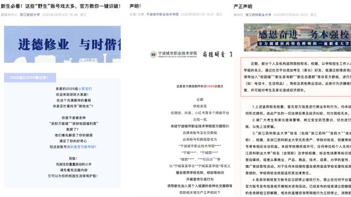 近段时间以来,浙江多所高校发布声明或提醒,曝光了一批非官方校园账号及群组,这些非官方“李鬼”账号广泛分布于微信、抖音、小红书、问卷调查网站等多个网络平台,通常擅自使用学校名称、校标等标识,以“百事通”“校园墙”“迎新群”“学长/学姐”等名义引流。