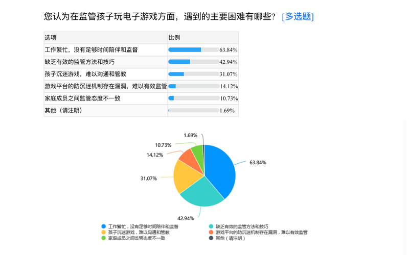 此次问卷调查的数据显示,在监管孩子玩电子游戏方面,受访家长遇到的主要困难有“工作繁忙,没有足够时间陪伴和监督”(63.84%)、“缺乏有效的监管方法和技巧”(42.94%)、“孩子沉迷游戏,难以沟通和管教”(31.07%)。
