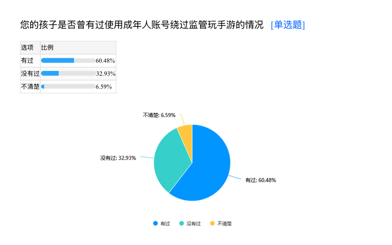 此次调查数据显示,60.48%的受访家长知晓孩子曾有过使用成年人账号绕过监管玩网游的情况,14.37%的受访家长表示,暑假期间孩子平均每周玩电子游戏的时长超过3小时。