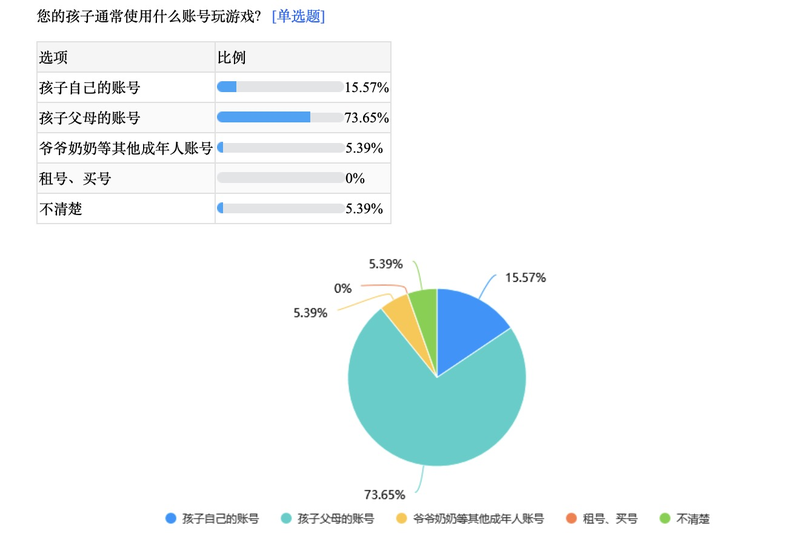 此外,对于孩子用成人账号或亲子共用账号打游戏,如果家长的监管意识、对待玩游戏态度不一致,甚至可能引发家庭冲突。“阻止他玩游戏这件事特别影响亲子关系,爸爸直接把账号给孩子,两个人一起玩,甚至爸爸打出高段位给儿子接着玩,一想到这个我就气得吐血。”家长Grace表示,父子俩共用游戏账号,爸爸对儿子玩网络游戏的时间不加控制,导致孩子暑假期间每周玩游戏的时间远超3小时。