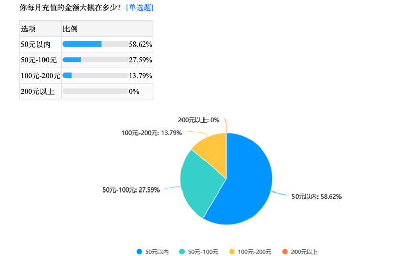 在此次调查中,一半以上受访学生称玩游戏时会充值,在全部学生中月充值50元以下占比58.62%,月充值50-100元学生占比27.59%。