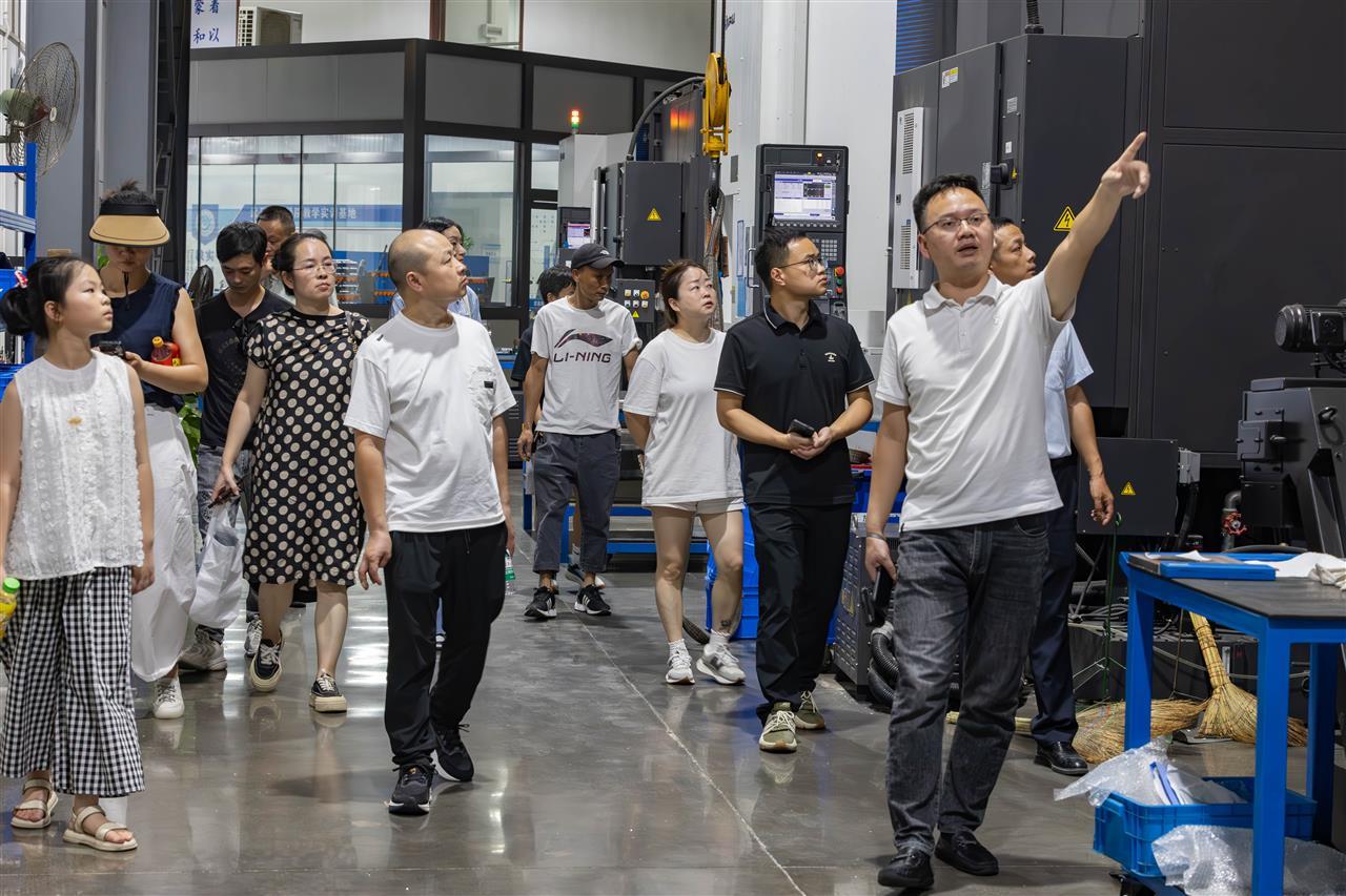 在首站该校校办工厂高端装备智造学院实训基地里,大家看到车间里宽敞明亮,理论与实践区域划分清晰,100余台高端精密制造设备有序运转,部分设备旁已有实习学生进行操作生产。“为了实现从校园到职场的无缝对接,近年来学校累计投入3亿元兴建校办工厂,让学生们直接接触操作最先进的精密制造设备,直接在真实的工作环境中打基础练技能。”汪洋向家长们介绍,通过在校办工厂的实训实习,该校已有不少学生毕业后直接留厂工作,或进入国企或央企,在企业当技术骨干。“今年4月学校投入了1.5亿元启动西区教学生活区的改造升级,后续将采购8000万元的教学设备,是希望有更多学生能在理实一体的环境中学习,助力他们练就硬核本领,能在本地就业、高质量就业。”
