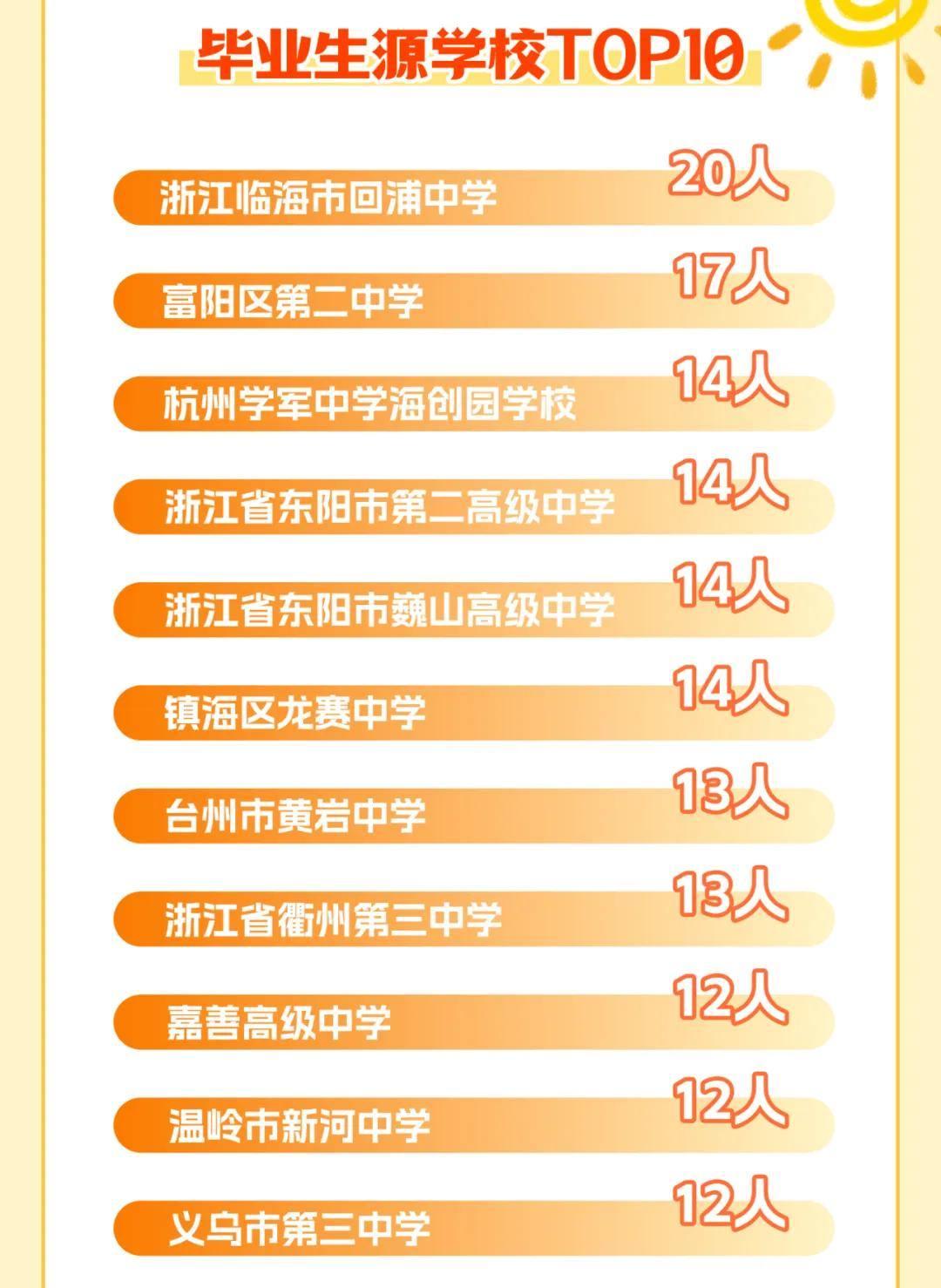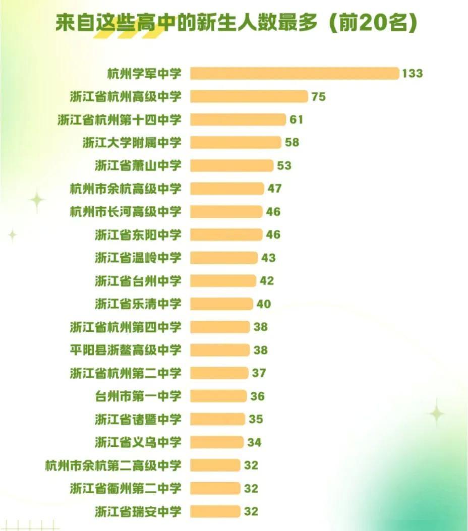在这些新生中,有133位新生来自杭州学军中学,84位新生来自杭州高级中学,53位新生来自萧山中学。浙江省内生源前二十的高中还有这些——