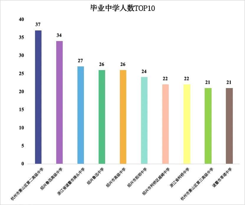 毕业于杭州市萧山区第二高级中学的学生人数最多,达到了37位,其次是绍兴鲁迅高级中学,输送了34位学生,位列第三的是浙江省诸暨市牌头中学,输送了27位学生。