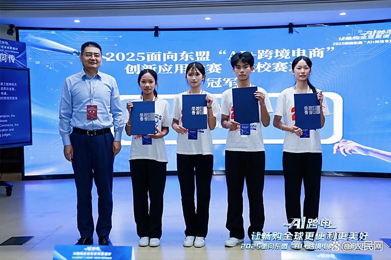 人民网南宁8月31日电 (冯肖慧)8月28日至30日,2025面向东盟“AI+跨境电商”创新应用大赛院校赛道决赛在南宁举办。20支团队同场竞技,最终评选出冠亚季军,以及最佳AI原创开发奖、最佳视觉设计奖、最佳媒体营销奖3个单项奖。