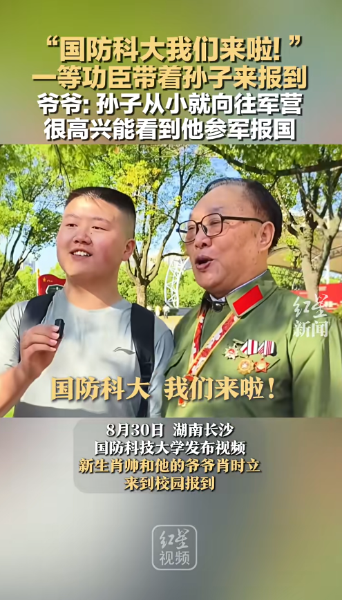 8月30日,国防科技大学发布视频,新生肖帅和他的爷爷肖时立来到校园报到。