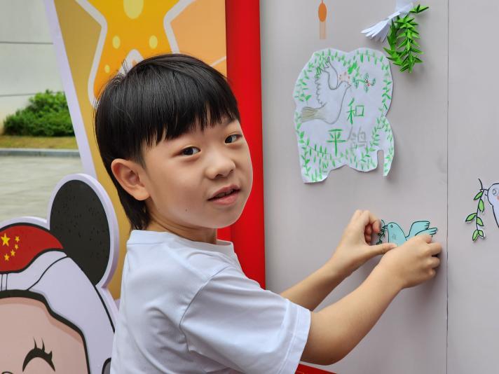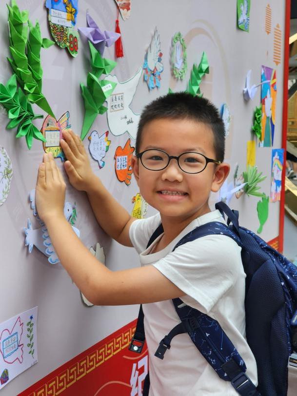 “和平心愿墙”位于校门主通道旁,“赓续烽火志 绘就未来图”主题语下为学生预留了专属展示空间。早在暑假期间,孩子们提笔绘制和平鸽、裁剪橄榄枝,家长陪伴书写心愿,一张张卡片既承载着“愿世界永远和平”的纯真期盼,也记录着“努力学习、报效祖国”的成长誓言。