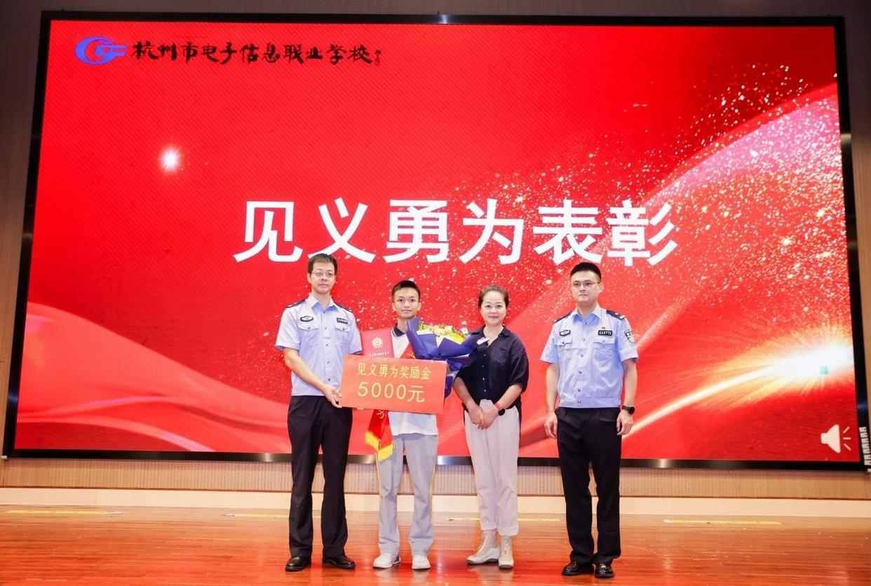 9月1日,杭州市电子信息职业学校的开学典礼上,出现了几位特殊的嘉宾——杭州市见义勇为基金会秘书长徐利华、杭州市公安局西湖分局防控治理中心副主任翟飞锋、北山派出所副所长蒋瑶。他们的出现,是为了表彰一位就读高三电子专业的同学——满建江。