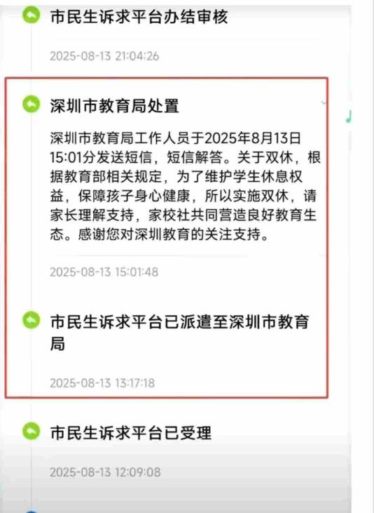 对此,有网友晒出疑似深圳市教育局的回应,内容明确表示会维持双休安排,维护学生的休息权益,保障孩子身心健康,并呼吁家长给与理解与支持。