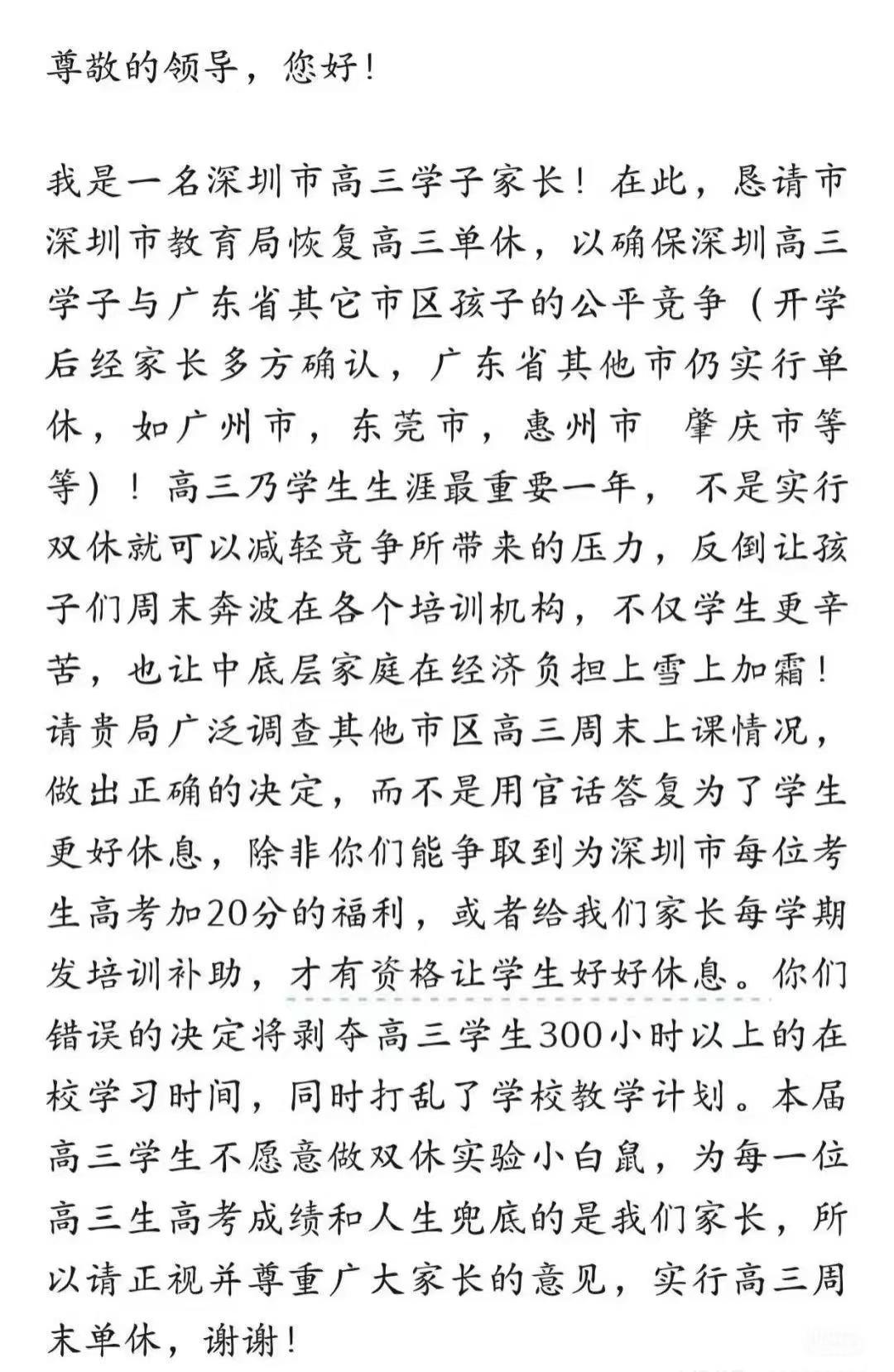 据了解,近日,深圳有学生家长写信请愿恢复高三单休。信中写道,双休可能打乱既定的教学节奏,且可能导致高三学生在校学习的总时长减少超过300小时。