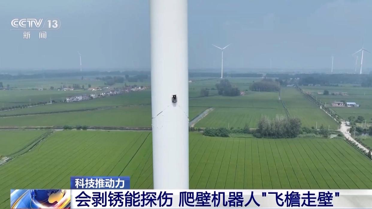 总台央视记者 古峻岭:这种爬壁机器人不仅在船舶除锈方面得心应手,在风电领域也同样大展身手。这个机器人就像一个巨型的蜘蛛,围绕着风电机组圆柱形的塔筒正在执行探伤检查作业。风电机组顶部近百吨重的主机舱和三根近百米长的叶片,所有的重量都压在塔筒上。不仅如此,塔筒还常年承受风吹日晒雨淋和强紫外线辐射等,时间长了会出现不同程度的老化。为确保万无一失,这个机器人采用电磁探伤技术,给塔筒做CT扫描,第一时间发现细小的裂缝等安全隐患。