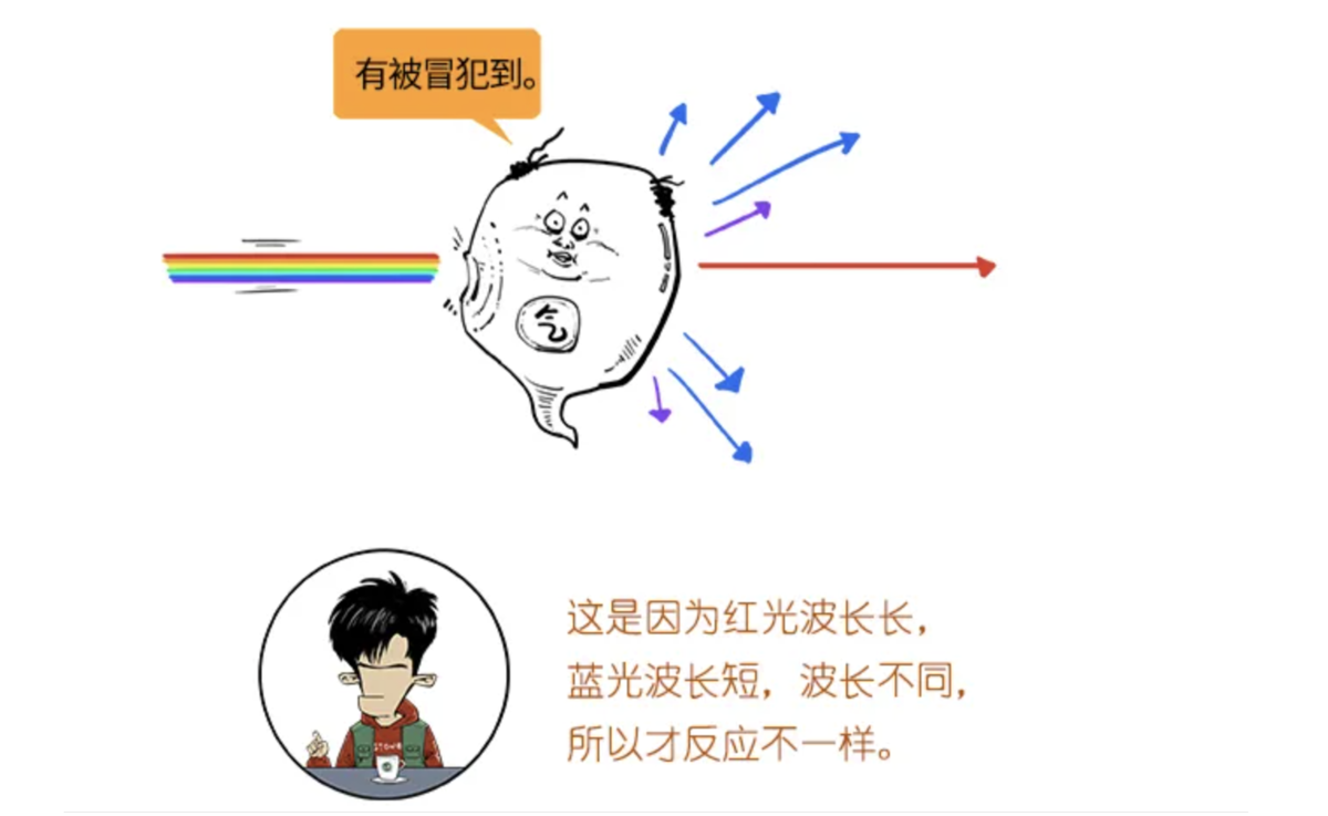 阳光射过来时,总免不了撞到它们。撞到小透明后,蓝光和紫光会发生散射,到处跑。