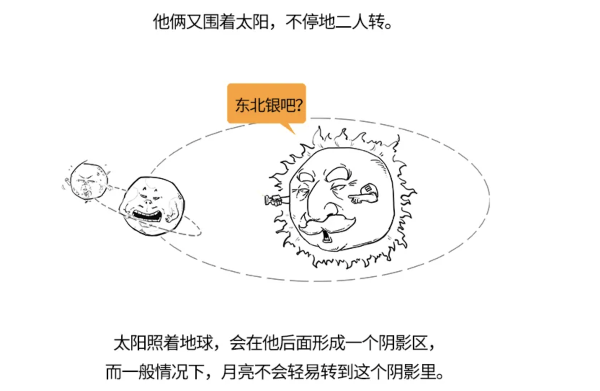 具体来说,月亮围着地球转,还有一点斜,他俩又围着太阳,不停地旋转。