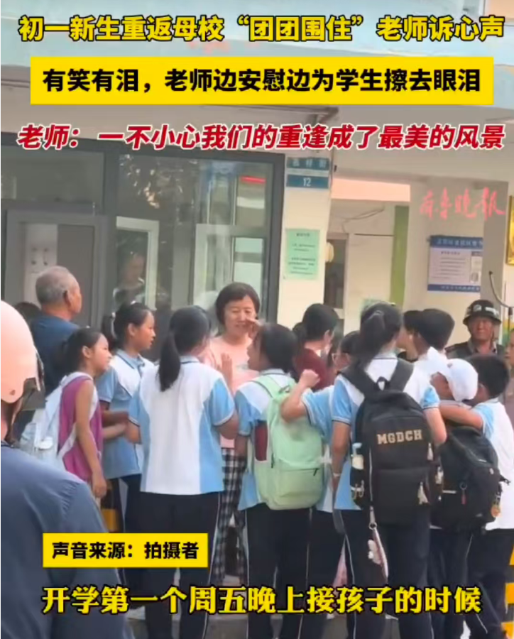 网友“平常心”更是用一段文字描写了这段美好的重逢:“开学第一个周末,十来个刚刚升入初中的孩子,像归巢的雏鸟,迫不及待地飞回了母校。他们簇拥在校门口,穿着崭新的中学校服,叽叽喳喳地分享着新世界的见闻,围着那个熟悉的身影一一小学班主任吴老师,那一刻,所有的成长与改变仿佛都消散了。阳光正好,映照着他们灿烂的笑脸,这道由纯真与感恩绘成的风景线,比秋日更亮眼,温暖了整条街道。”