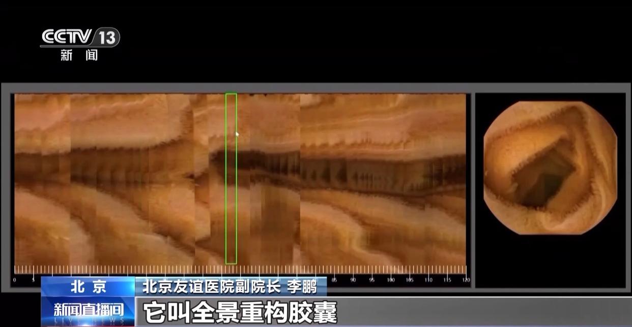 北京友谊医院副院长 李鹏:它叫全景重构胶囊,呈现出一个三维立体的连续画面,来诊断。如果发现哪个地方有问题,还可以回溯,看到原来的片子。大大节省了医生的劳动力。我们可以把它做成家庭版,可以买来胶囊在家里吃,信号直接传到医院。很有可能有一天,我们都不去医院做胃肠镜检查了。