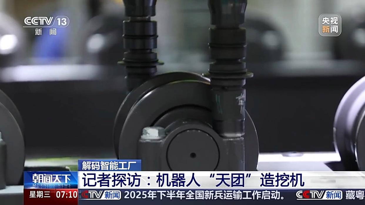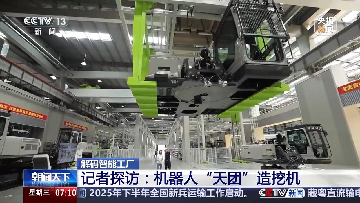总台央视记者 张丛婧:造挖掘机可能并不稀奇,但您见过机器人生产挖掘机吗?在这个智能工厂里,干活的主力军可都是各种类型的机器人,它们不仅可以自己搬东西,还能够这样进厂拧螺丝。这些赛博师傅们干活怎么样?咱们一起进厂看看。