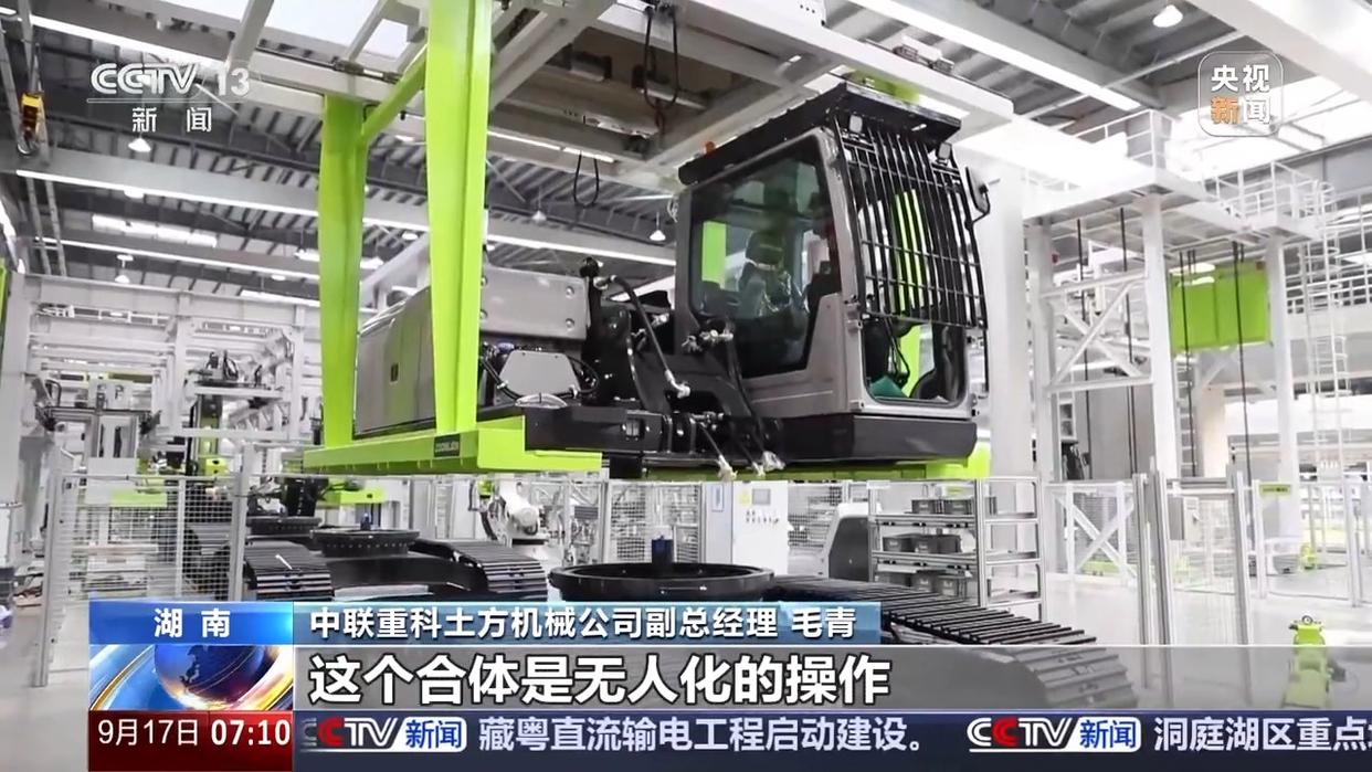 中联重科土方机械公司副总经理 毛青:这是我们的一个智能合车的装置,这个合体是无人化的操作,原来是需要5个员工,现在通过我们智能化的提升,实现了一个人来看一看,就可以实现上下车的合体。