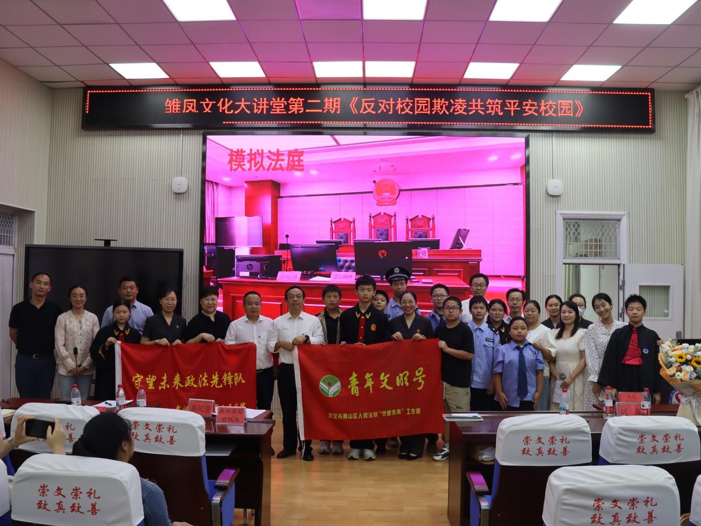 9月18日下午,武汉市青山区钢城二中报告厅内的空气仿佛被这几句对话攥得发紧。模拟搭建的“审判席”上,“审判长”陈先旭同学身着深黑色法袍,右手高高举起法槌,“咚”的一声重响——“青山区人民法庭”在此刻“开庭”,该校“雏凤文化大讲堂”第二期“反对校园欺凌,共筑平安校园”主题活动就此拉开帷幕。台下,八年级学生代表、家长代表、区教育局基教科领导、武钢实验学校教联体代表及校领导班子成员屏息凝视,目光齐刷刷地聚焦在“法庭”中央。