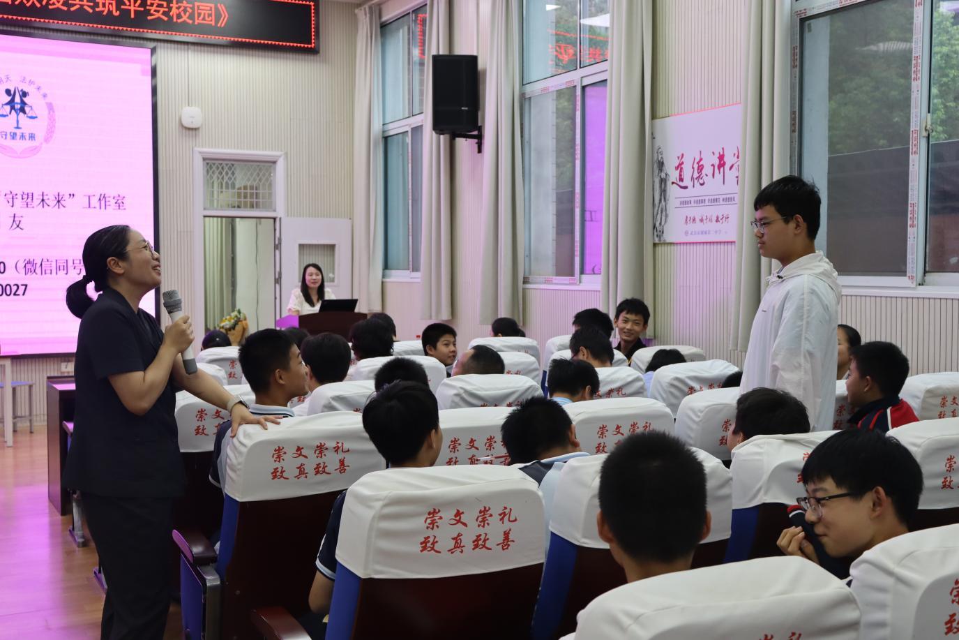 “要是被霸凌者反过来打了施暴者,算正当防卫吗?”“朋友圈发别人丑照嘲笑,算不算欺凌?”互动环节,刘友法官拿起话筒的瞬间,台下立刻举起一片小手。面对学生最关心的“反击边界”问题,刘法官掏出提前准备的漫画卡片:“看这张图,别人打你时你推开他是自卫,但追着打就是互殴了。” 针对网络欺凌,她特意举例:“去年有个学生发同学糗事视频,点赞过千,最后赔了三万元,还得公开道歉。” 802班付弘恩同学站起来追问:“那我悄悄拍了施暴视频给老师,算侵犯隐私吗?”刘法官笑着鼓掌:“为了制止伤害的取证,当然不算!这是勇敢的表现。”