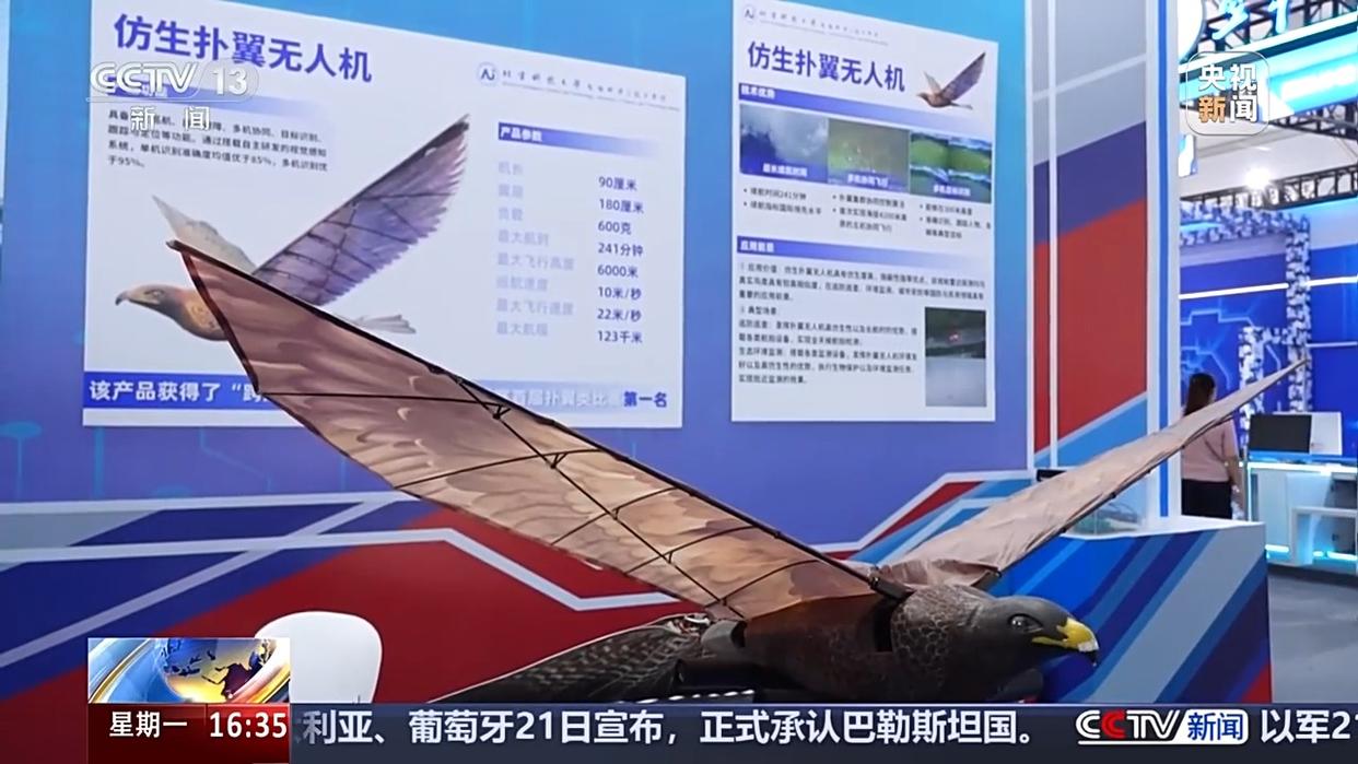 北京科技大学智能仿生无人系统团队 文全齐:我们这款仿生扑翼无人机是模仿高原鹰类研制的,设计难点主要是在于扑翼这种动力学模型比较复杂,并且对于它的飞行控制算法比较难研究,同时就是因为我们是需要用它来做一个侦察的任务,它的目标识别与定位跟踪也是比较难的一个点。我们这款产品是具备自主巡航、自主避障、多机协同、目标识别、跟踪定位等功能,并且首次在海拔4200米的高原实现了五机协同飞行侦察的一个任务。