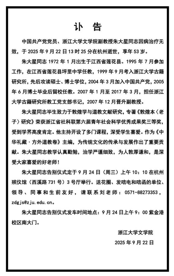 中国共产党党员、浙江大学文学院副教授朱大星同志因病治疗无效,于2025年9月22日13时25分在杭州逝世,享年53岁。朱大星同志 1972年1月出生于江西省莲花县。1995年7月参加工作,在江西省莲花县坪里中学任教,1999年9月考入浙江大学古籍研究所,先后攻读硕士、博士学位,2004年3月加入中国共产党,2005年6月博士毕业后留校任教。2007年1月至2017年3月,担任浙江大学古籍研究所教工党支部书记,2007年12月晋升副教授。