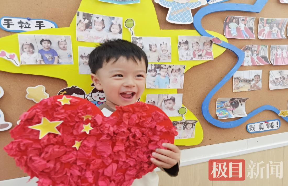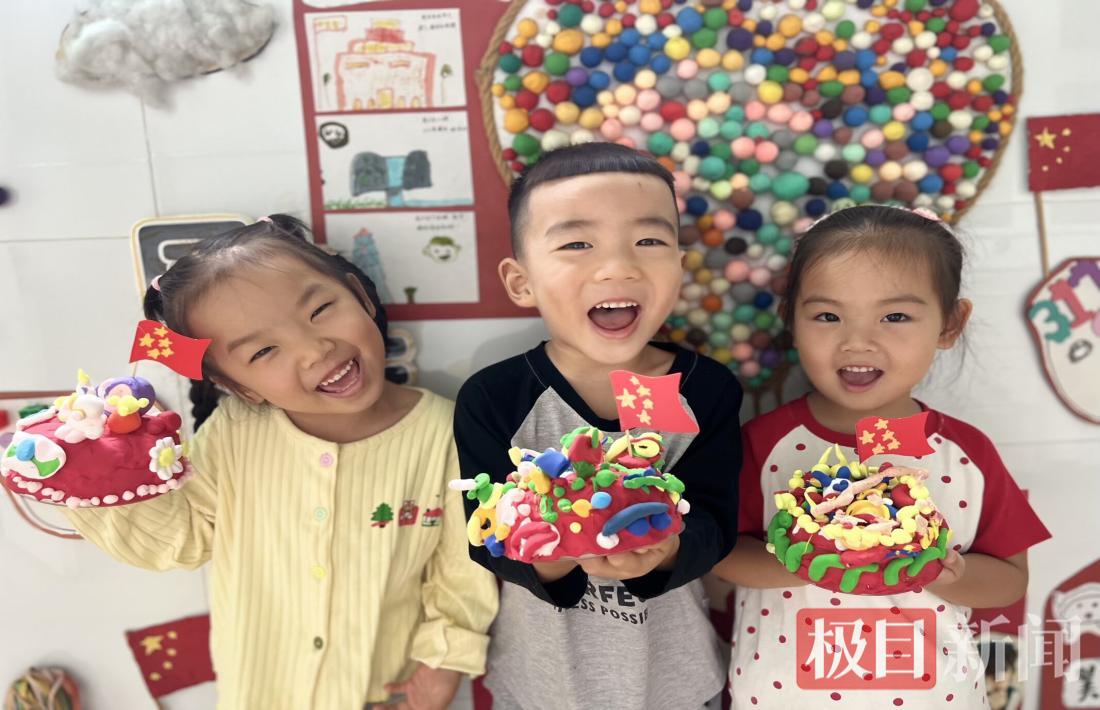 中班小朋友捧着彩泥做的“生日蛋糕”,红的“奶油”黄的“糖霜”格外鲜亮。“祖国妈妈生日快乐!”孩子们凑在镜头前,笑得像花儿一样。